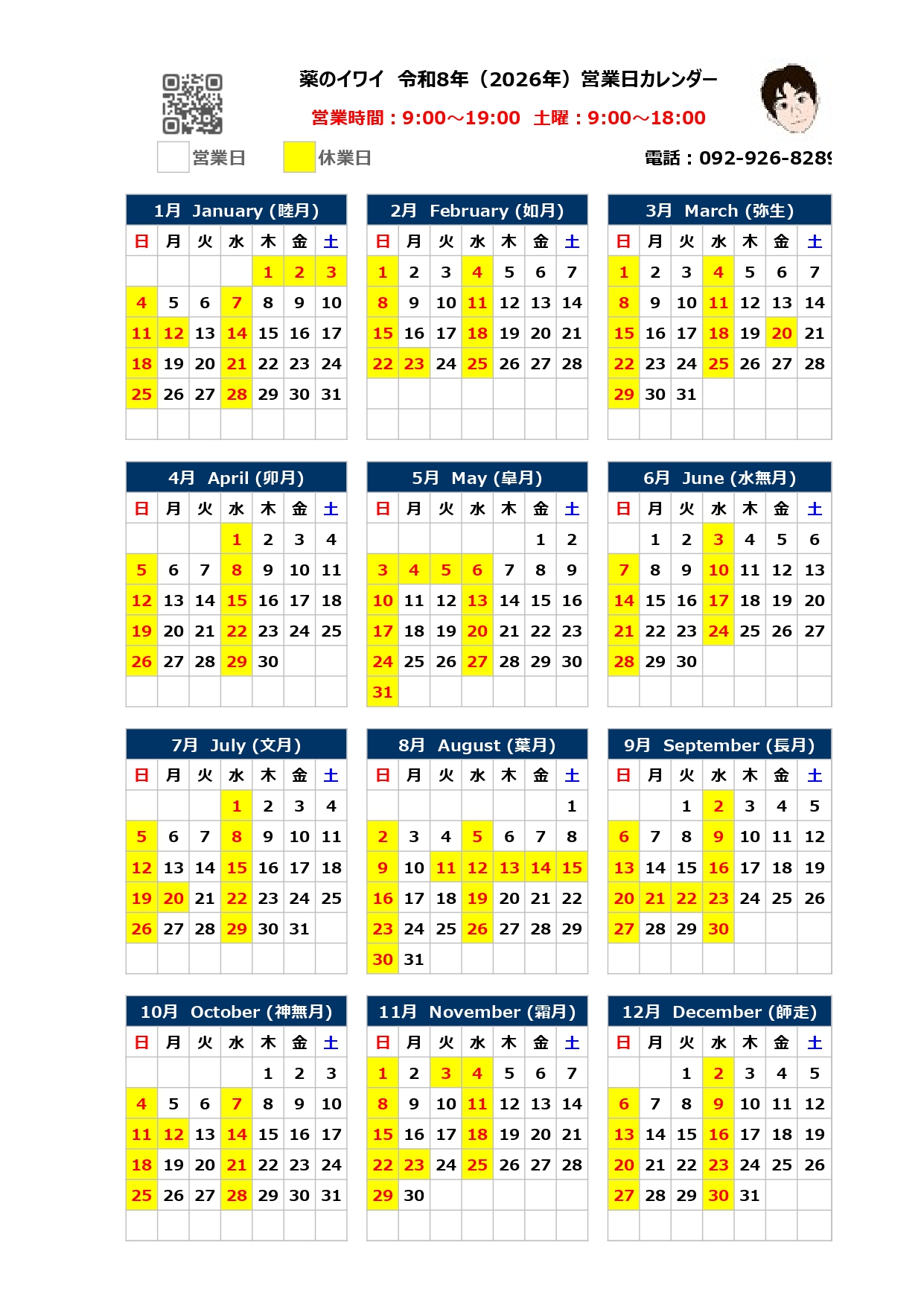 2021/08/28 著作権表示を簡素化 © DRUGIWAI 2021 2021/08/22 QRコードを設置 2021/08/20 お問い合わせフォーム スマホ対応レスポンシブデザインに変更 2021/08/16 営業日カレンダーを設置 |